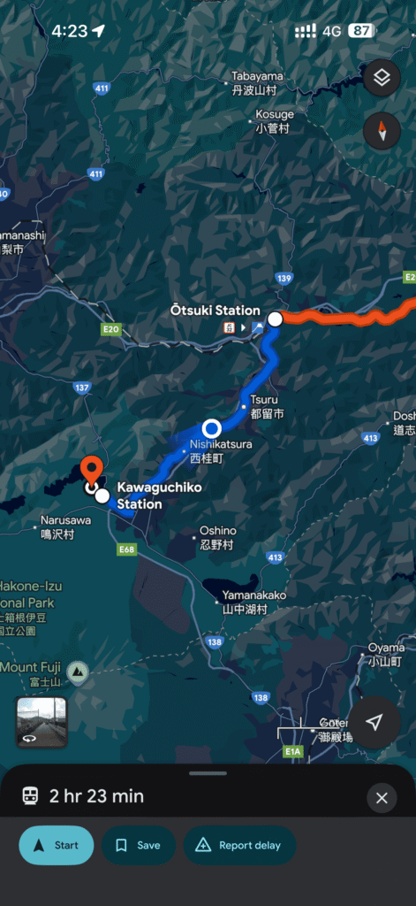 Step 2: Tokyo to Otsuki (JR Chuo Line) – From Tokyo Station, took JR Chuo Line to Otsuki – Duration: About 1h 20min – Cost: Included in JR network
