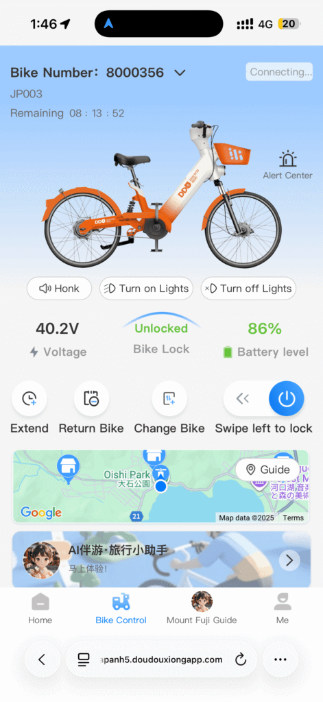 The full loop around Lake Kawaguchiko is about 20-23km. On e-bike, takes around 2 hours pure cycling. But with photo stops, lunch breaks, exploring – I spent like 5-6 hours.