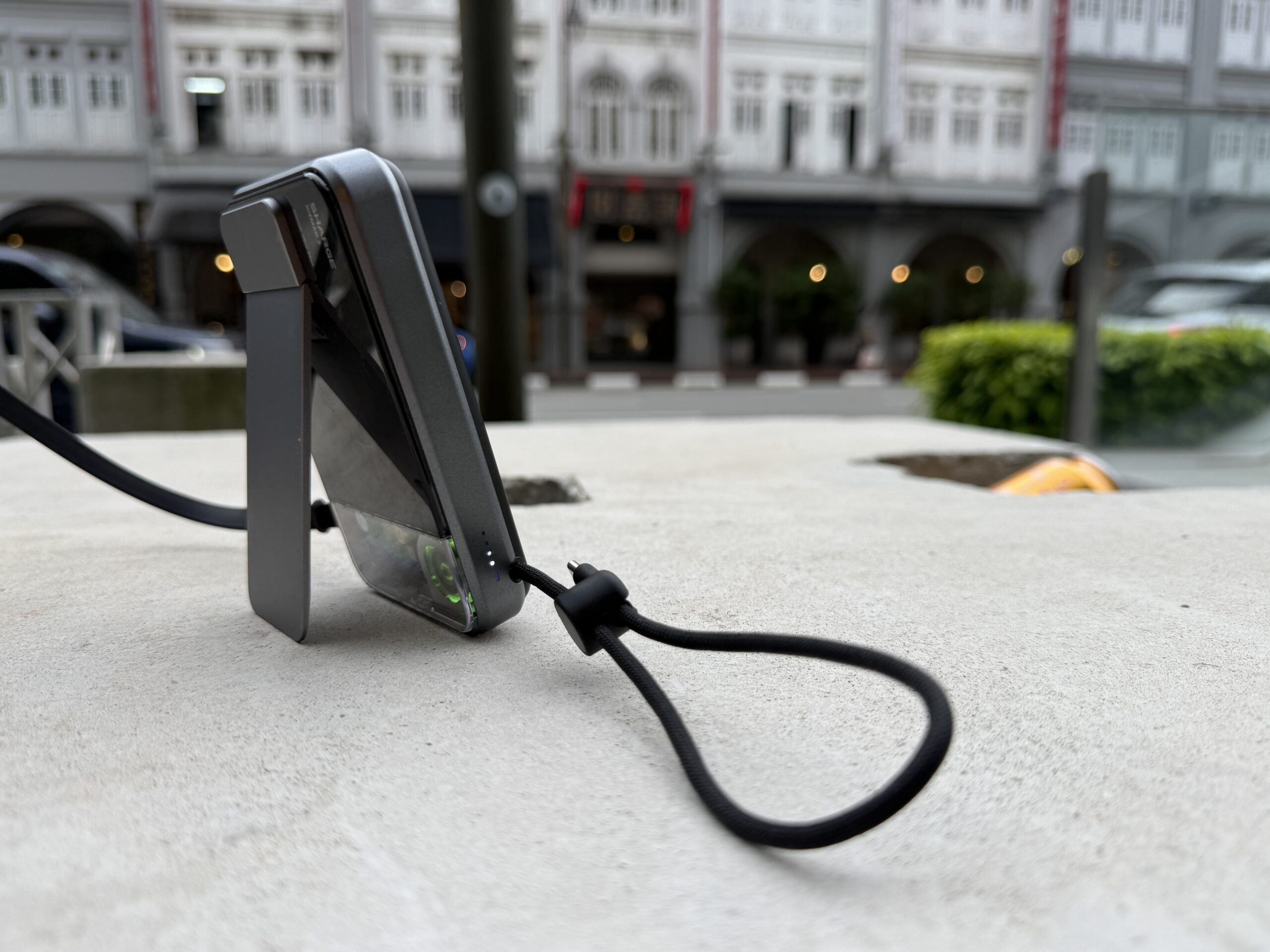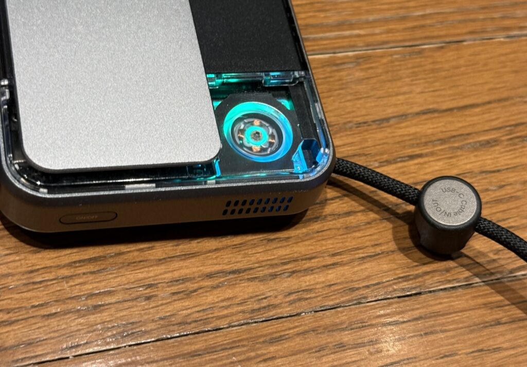 Ok this is the best feature hands down. Got a built-in USB-C cable that you just pull out from the bottom. Can extend it, plug into your phone, then use the MagSafe to stick it on the back of your iPhone.